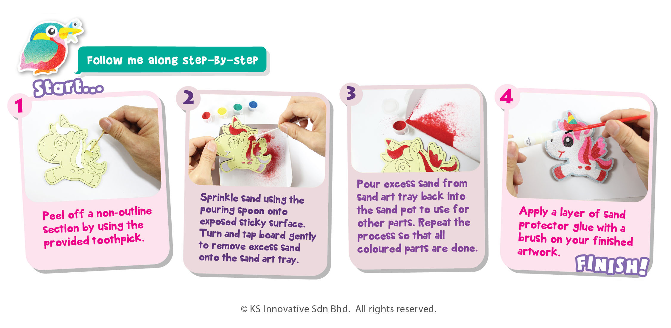 Sing along in happy chirps with our Sand Art Bird Boards! They come in 5 adorable bird designs, you may refer to our sand artist's colouring or colour your very own cute bird! This kit comes with everything ready, with a Sand Art tray to easily save more of your sand and sand protector glue to shield your sand art when it is complete.