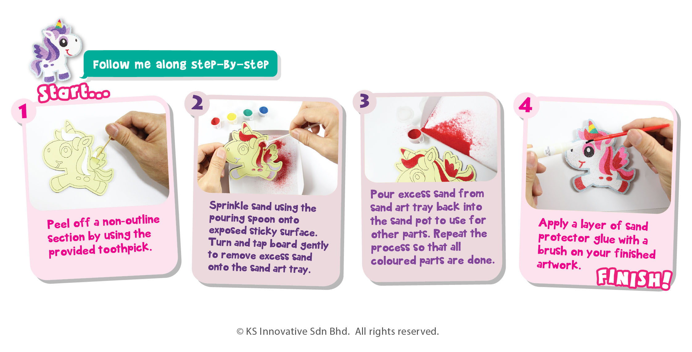 Sprinkle sand and fly into magical land with our Sand Art Unicorn Magnets! They come in 5 unique Unicorn designs, you may refer to our sand artist's colouring or colour your very own Unicorn! This kit comes with everything ready, with a Sand Art tray to easily save more of your sand and sand protector glue to shield your sand art when it is complete.