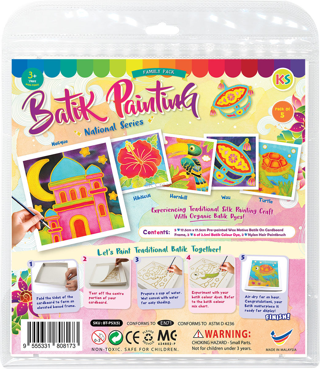Each Family Pack includes 5 different batik designs, ready to paint and bursting with potential. Each design comes pre-waxed on quality fabric, making it easy for children to enjoy an authentic batik experience while learning about colour blending, patterns, and cultural heritage. Simply pick up a brush and watch your artwork come to life – no special skills or messy preparation required!