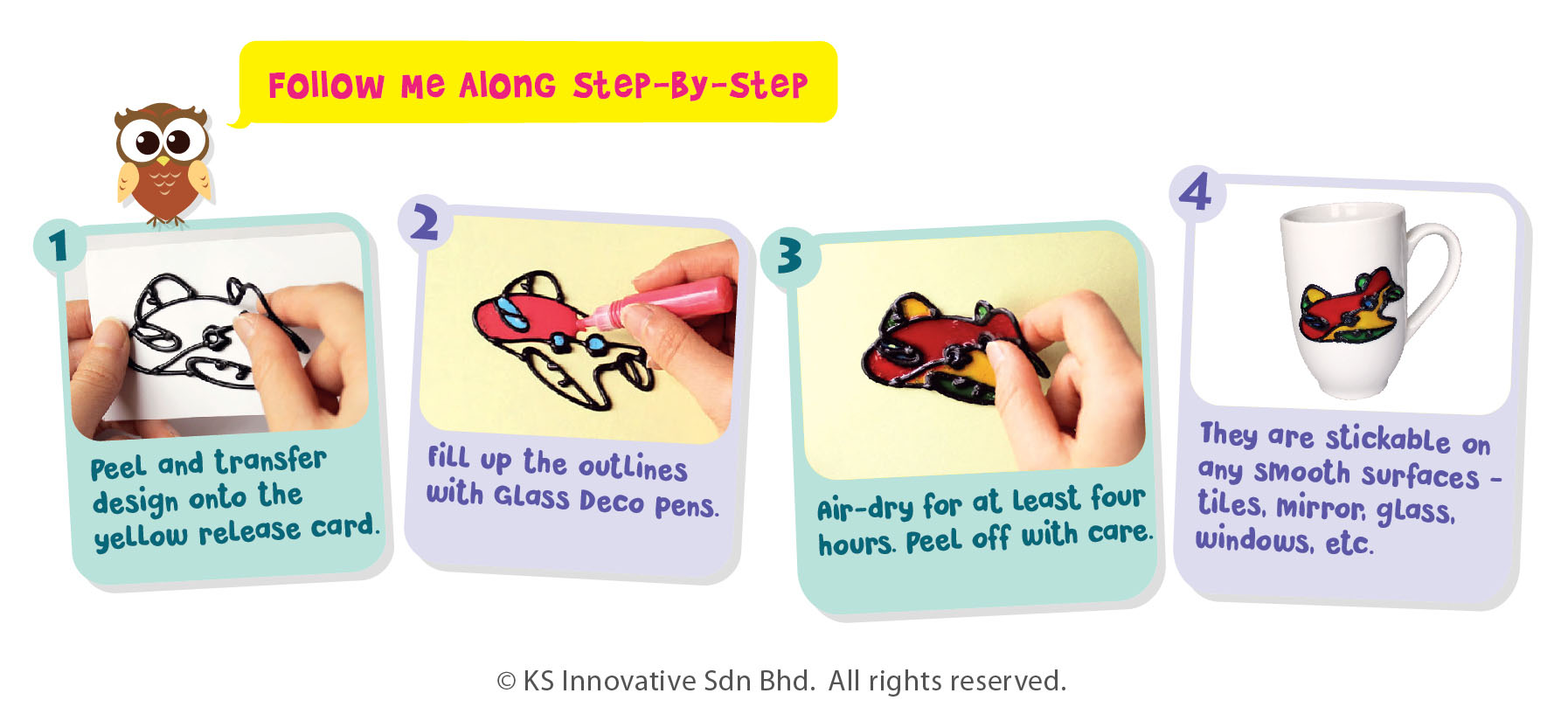 One of our most popular crafts, the glass deco kit is equipped with everything you need to colour 3 adorable assorted cartoon designs. They are self-adhesive and can be stuck on glass, window, coffee cups, ceramic, tiles and other smooth surfaces!