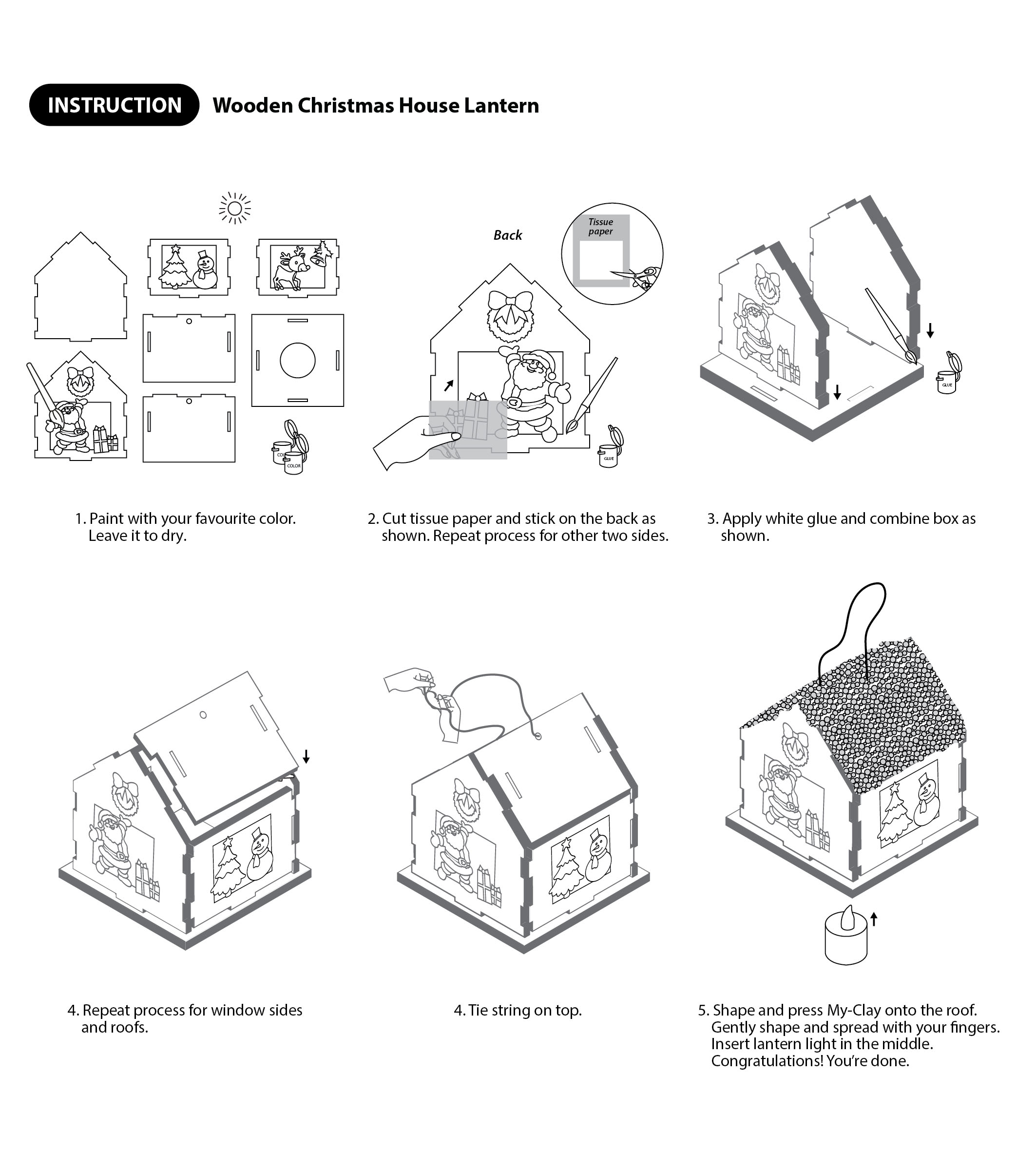 You can hang this beautiful DIY Christmas lantern craft powered by safe LED light and watch as it flickers with delight! Comes in 2 lovely designs, Santa Claus with his gifts and Snowman with candies. Colour as you like and knead white beady foam clay to top off the roof to resemble snowfall on rooftop! A warm and cosy little house for display is your reward when it is done. Kids will love to build this house from scratch.