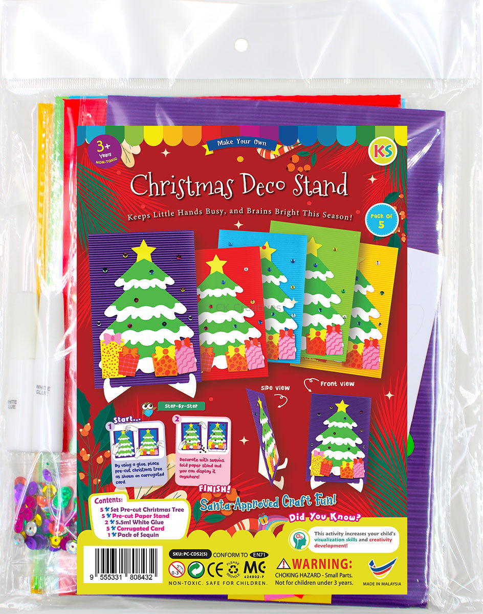 Introducing the most EPIC Christmas craft of the year: CHRISTMAS TREE RAINBOW STAND-UP SQUAD – where FIVE totally awesome festive trees burst onto your table in the wildest holiday colours ever! This all-in-one kit lets kids build five dazzling standing Christmas trees, each in a different merry colour: classic green, festive red, cool blue, sunny yellow, and rich purple. Every tree stands proudly on its own sturdy corrugated cardboard backdrop in a matching shade, creating a bright and beautiful Christmas display for the mantelpiece, windowsill, or classroom.