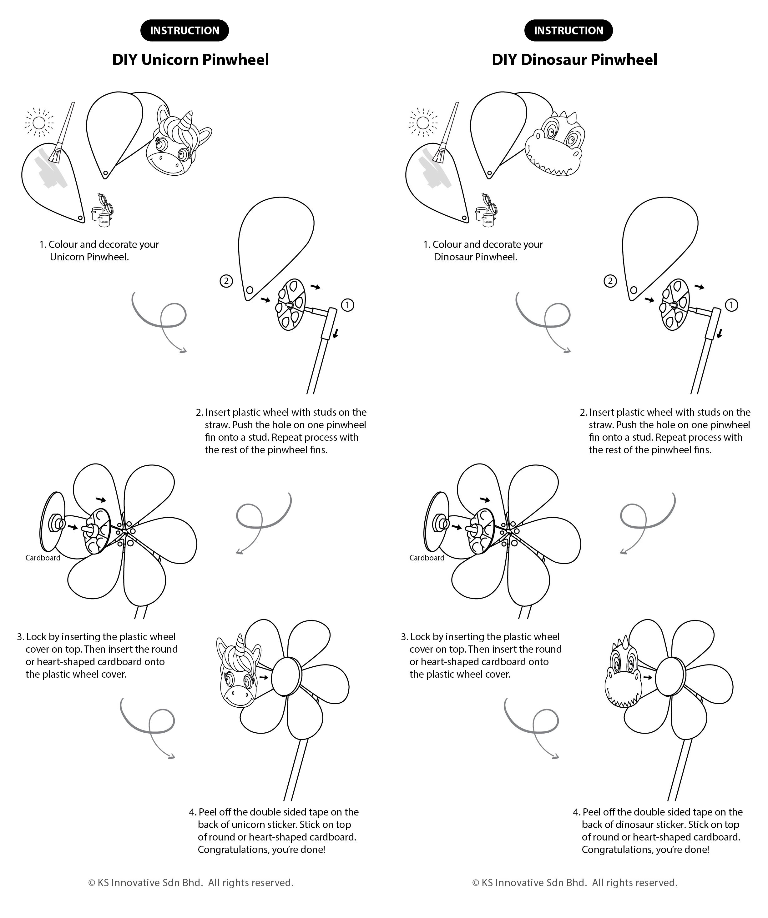 Craft and play with this DIY Unicorn or Dinosaur pinwheel! Let imagination take its course as kids will have fun colouring and assembling the pinwheels by themselves. The unicorn and dinosaur outlines are pre-drawn which will make colouring easier and enjoyable. This kit comes with everything ready, including colour paints.