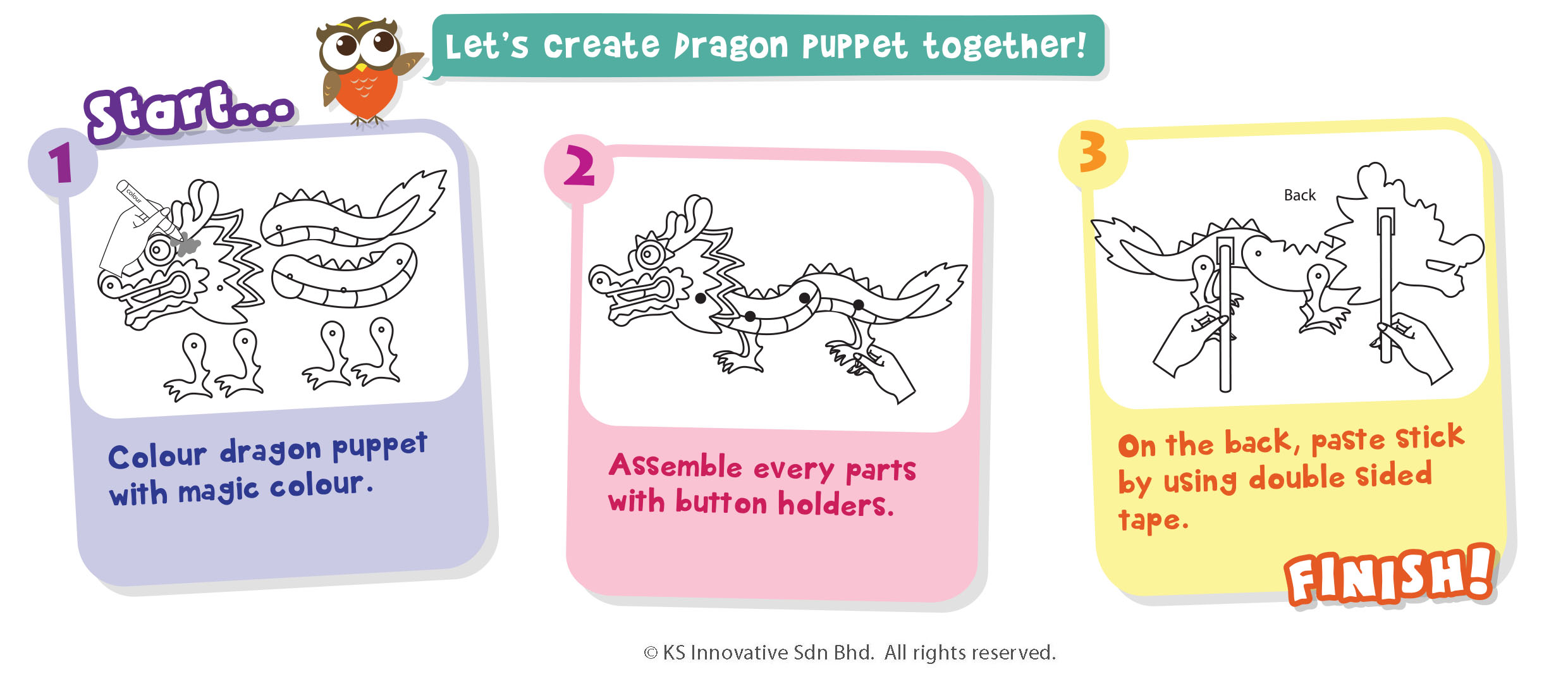 Usher in Chinese New Year with our mystical and easy to make Dragon puppet! Chinese dragons are rich in symbolism and mythology, bring it to life with our Dragon puppet kit to usher in good luck and prosperity. Imaginative kids will love to play and flex their creative minds for amazing story-telling sessions! Our Dragon puppet has details like a long serpentine body, claws, and the iconic antler-like horns, kids only have to use their vision and artistic skill to colour in the Dragon with our magic colour pens and then assembling all parts together!