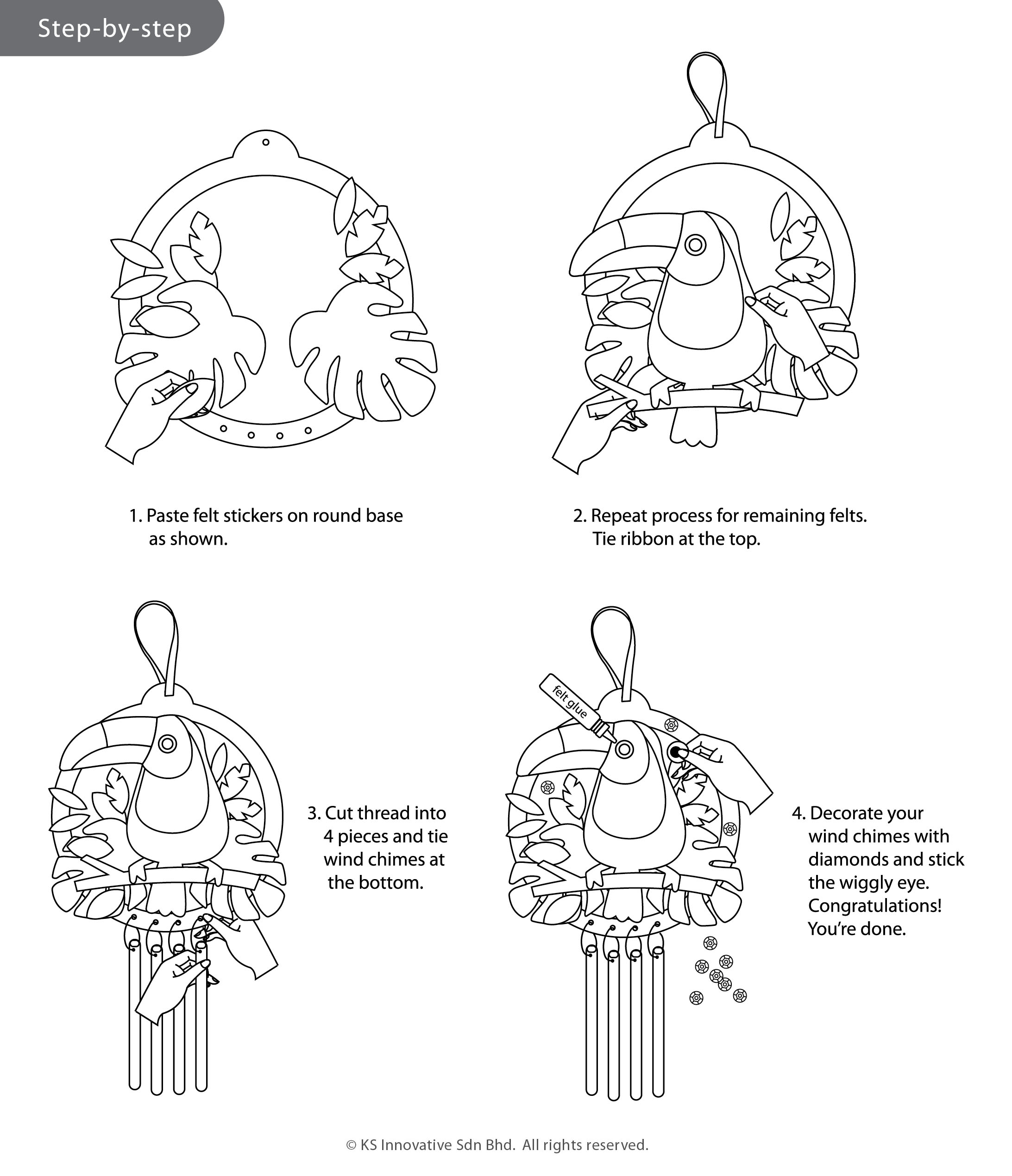 Imagine the magical wind-blown sounds these fabulous, felt-based metal wind chimes makes at your favourite breezy spot! Not only are they beautiful to look at and brighten the area, the metal chimes makes incredibly sweet sounds when they clink in the wind that will definitely lift up your mood! Kids can choose between 6 beautiful felt animal designs - Angelfish, Toucan, Tiger, Lion, Clownfish and Parrot! The kit comes with everything ready and the felt are pre-cut so no scissors are required, only creative minds that love to build with felt sticker shapes! Also included is a pack of assorted colourful diamonds for that extra bling!