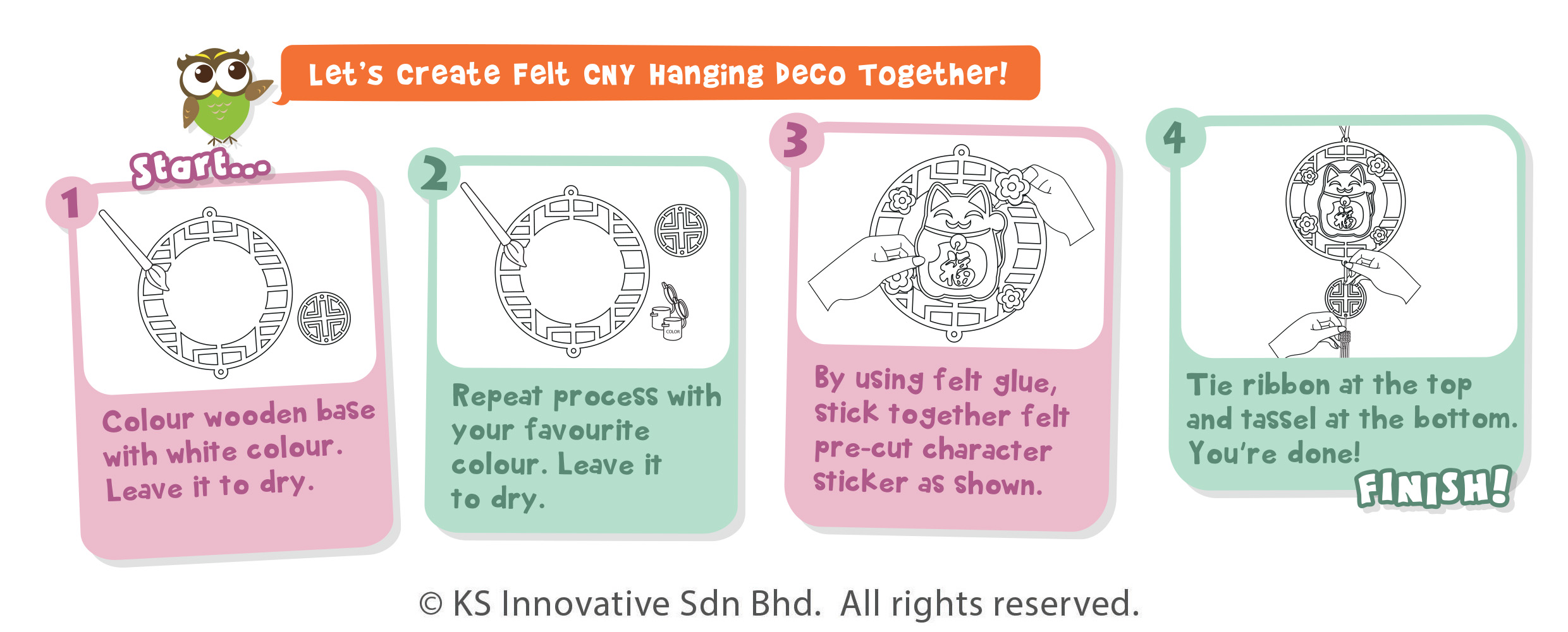 Invite good luck, happiness and prosperity to your home with our Felt Chinese New Year hanging decoration! A feast for the eyes in 3 different, vibrant designs - God of Wealth, Spring Mandarin Orange and Fortune Cat, they are guaranteed to add festive and joyful atmosphere all around! Kids will love to arrange the felt stickers on the paint-it-yourself pre-cut wooden boards. Add ribbon and tassel for the finishing touch!
