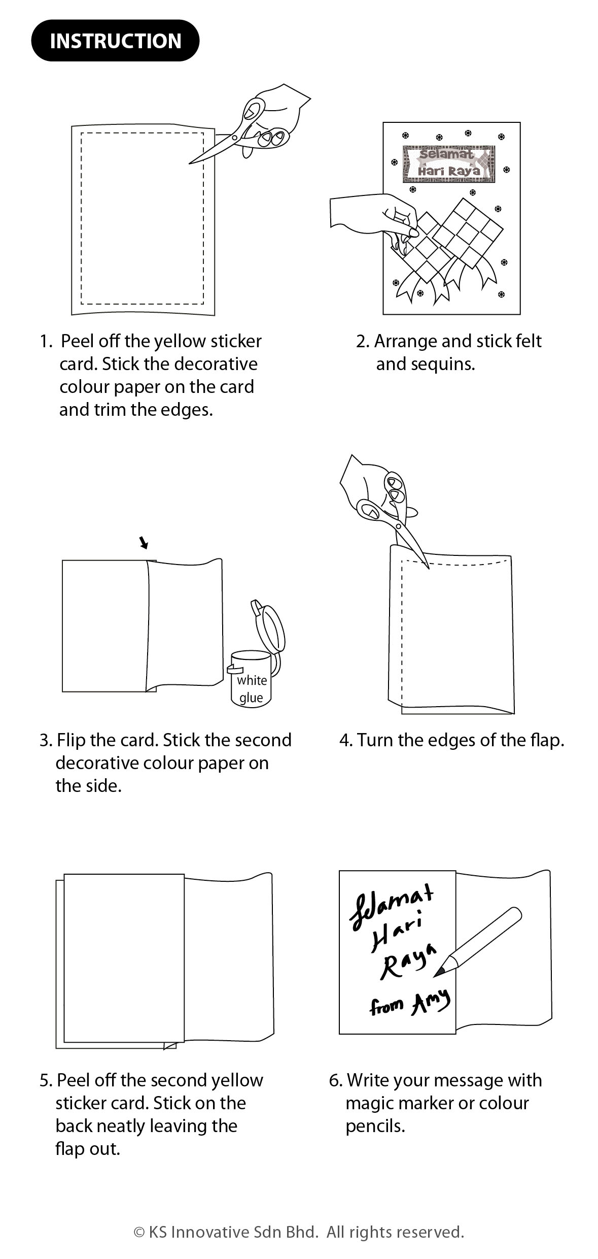 Personalize your greeting cards this Hari Raya with easy-to-complete D.I.Y. ketupat card that are perfect for getting kids into the holiday spirit! Arrange felt stickers and decorate with sequins. Write a beautiful message to go along with the card. The card's cover is a nice layer of mixed pulp paper with shiny bits of strings.