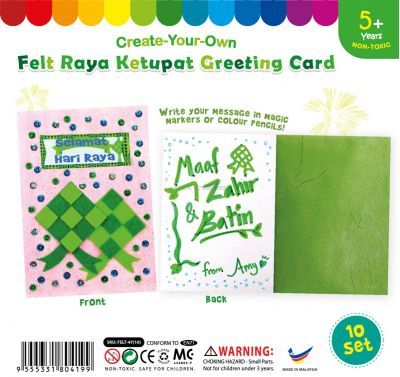 Personalize your greeting cards this Hari Raya with easy-to-complete D.I.Y. ketupat card that are perfect for getting kids into the holiday spirit! Arrange felt stickers and decorate with sequins. Write a beautiful message to go along with the card. The card's cover is a nice layer of mixed pulp paper with shiny bits of strings.
