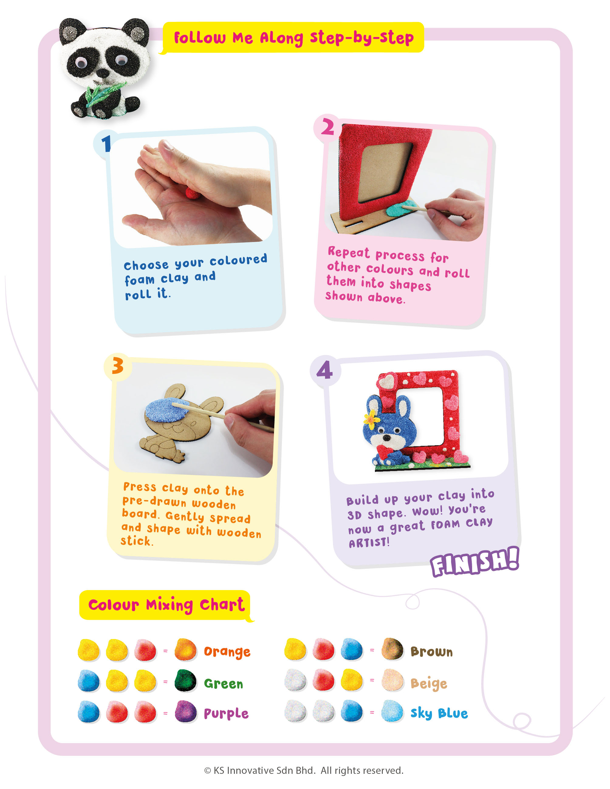 Sculpt, construct and display Foam Clay Photo Frame in Rabbit, Kitten, Baby Dino, Panda and Duckling themes! New and popular Foam Clay deco activity kit provides hours of fun while cultivating motor skills and patience. Foam Clay is a lightweight clay with beady texture, easy to sculpt and air-dry. Kids will adore rolling, squeezing, twirling, and pulling Foam Clay into 3D shapes. The animal characters are pre-drawn in MDF and kids will learn to press the clay onto it, along with the MDF photo frame. The result will be a stunning 3D effect photo frame that you can insert your photograph for keepsakes!