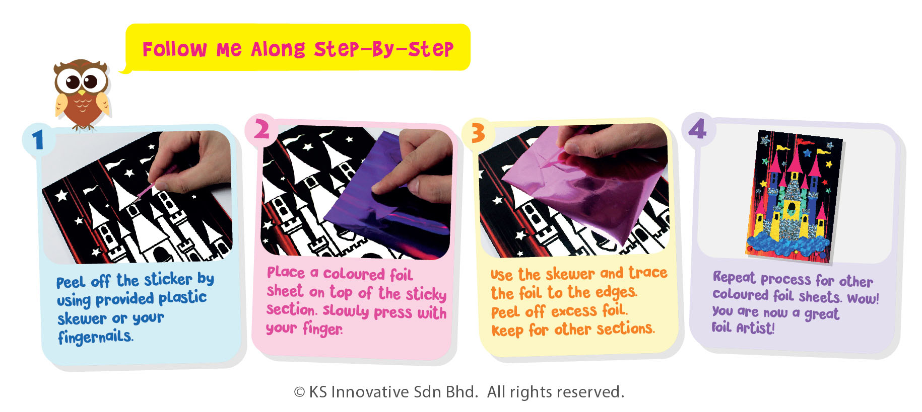 Construct holographic Foil papers in 8 different colours and patterns! The foil sticker card design is pre-cut so there is no need for scissors. Peel off a section and transfer foil on top of the exposed sticky surface, trace with plastic skewer and voila! A stunning, multi-patterned and colourful Foil Art! Cultivates patience (hours of fun!) and motor skills.