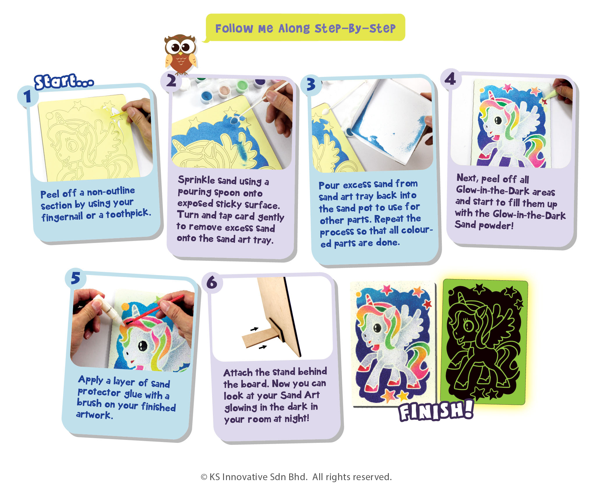 Peel, sprinkle and display your beautiful Sand Art that glows in the dark at night! Sprinkle the Glow-In-The-Dark Sand powder on areas like outlines and borders that will allow you to see them glow when the surrounding is dark. Backed on MDF board, it is sturdy and comes with a stand for display on table top or dresser. Everything is provided in this kit, including sand protector glue to shield your sand art when it is complete. Only creativity is needed!