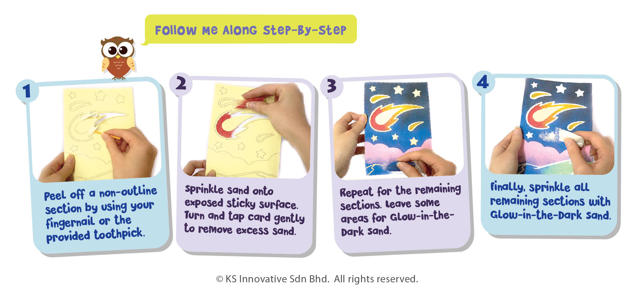 Peel and sprinkle beautiful Sand Art that glows in the dark at night! Get all and display on your bedroom walls. Comes in 10 different outer space theme!