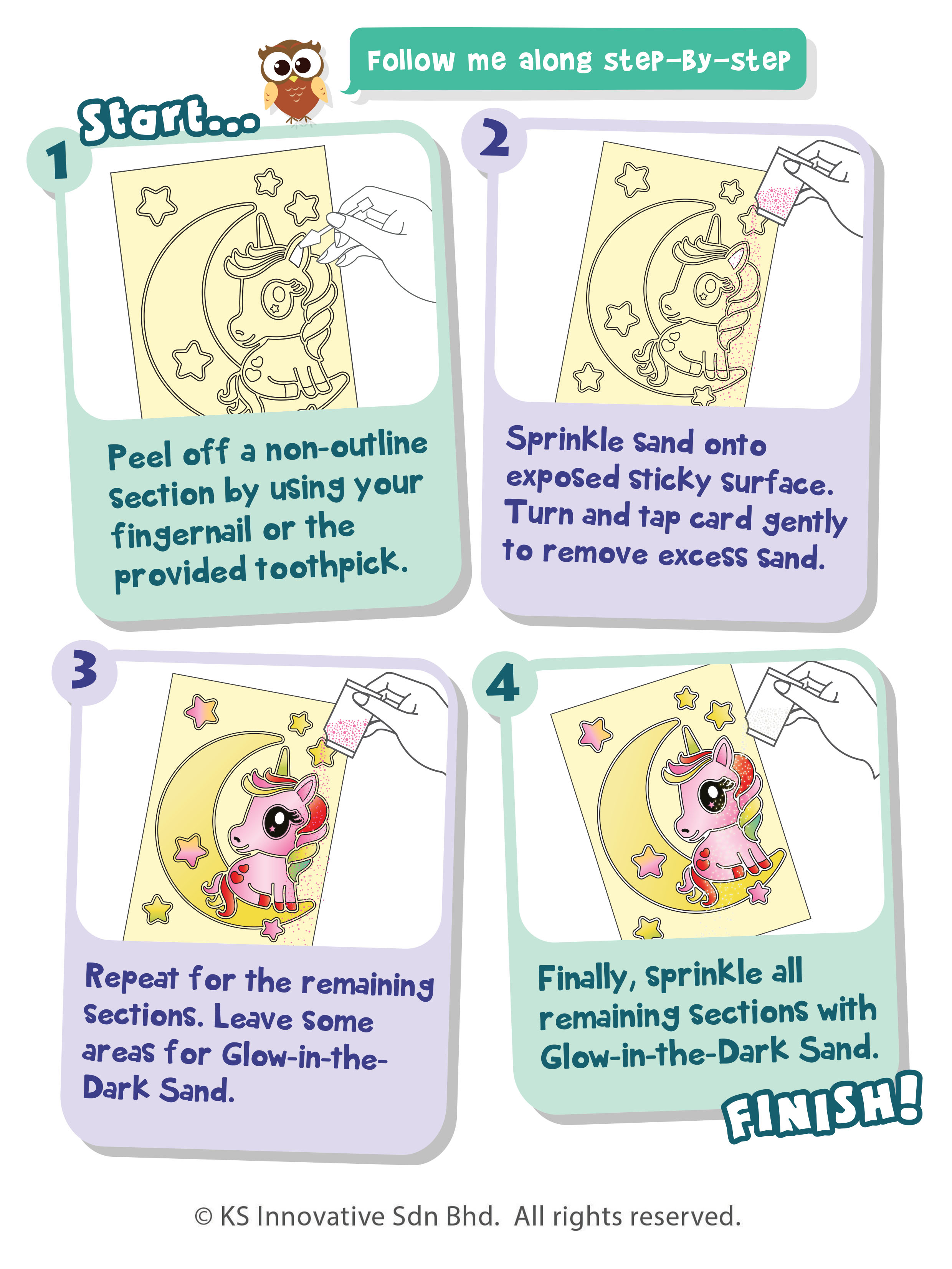 Peel and sprinkle beautiful Sand Art that glows in the dark at night! Get all and display on your bedroom walls. Comes in 10 different animal theme!