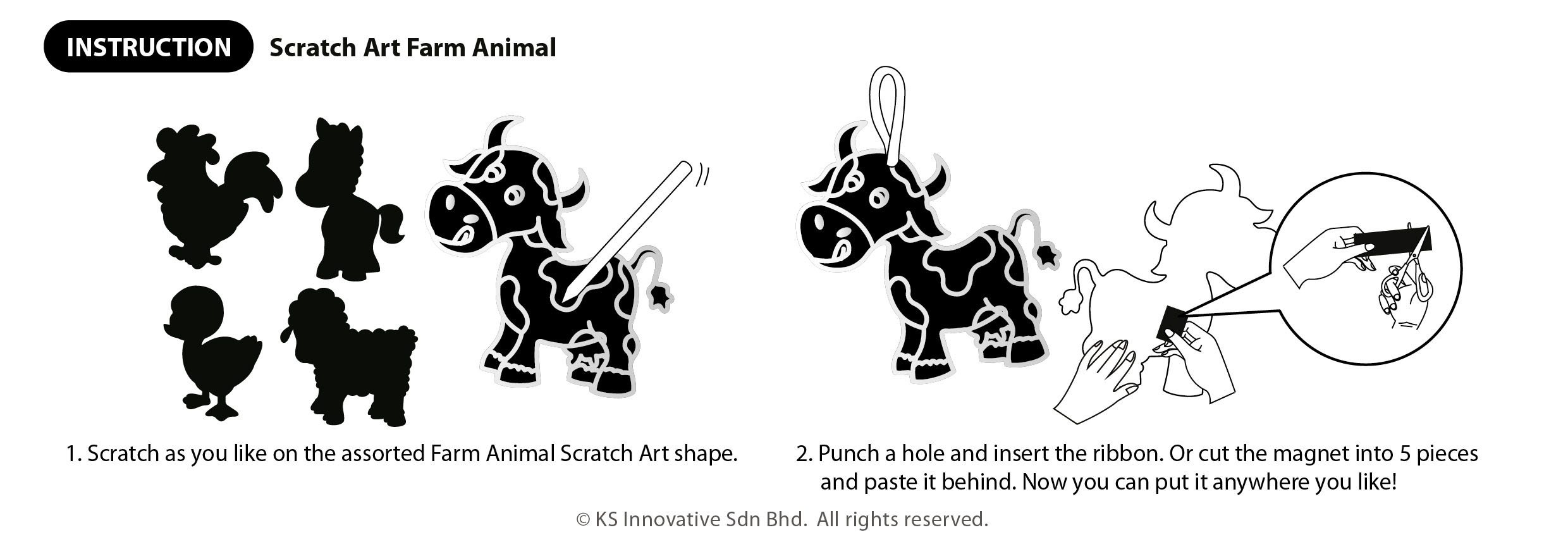 Scratch Art farm animals are a top favourite among kids! Comes in 5 different shapes to draw on - Duck, Cow, Chicken, Sheep and Horse. The material behind this Scratch Art surface is a tough and sturdy artcard backing. Scratching the black surface with the provided scratch art stylus will reveal beautiful rainbow-like colours underneath! You can choose to punch a hole and hang it using ribbons or stick magnet strip behind as fridge magnets.