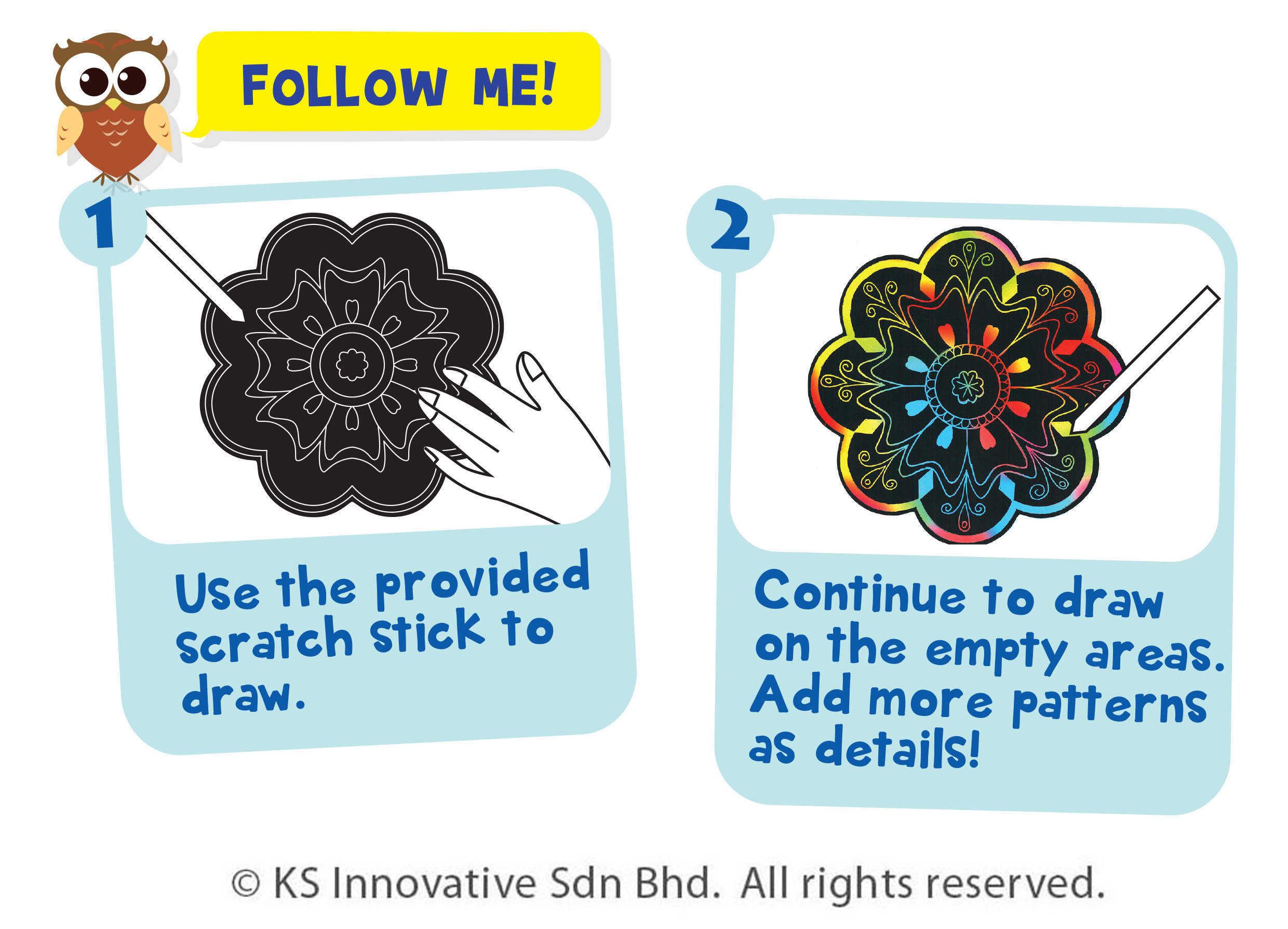 Scratch and doodle pre-cut Mandala Scratch Art in 5 intricate and unique pre-printed Mandala shapes and see them appear in rainbow colours! Mandala shapes represent different meanings such as circular and symmetry both symbolize unity, balance and harmony. Scratch doodling and repeating patterns lowers stress, relaxes and calms busy minds! As well as being a great creative outlet for everyone!