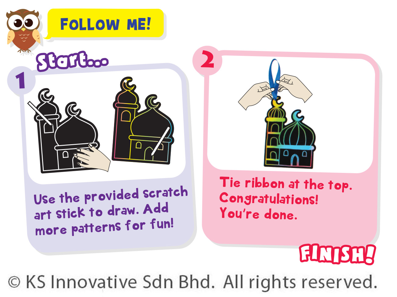 - 12 ready-to-scratch festive Hari Raya designs: cheeky Ketupat, glowing Pelita lamp, twinkly Crescent Moon & Star, cute Oil Lamp, musical Malay drum, happy Raya Malay boy and girl, Mosque Silhouette, cosy Prayer Mat, surprise Duit Raya Packet, lush Raya floral ring and delicious dates!