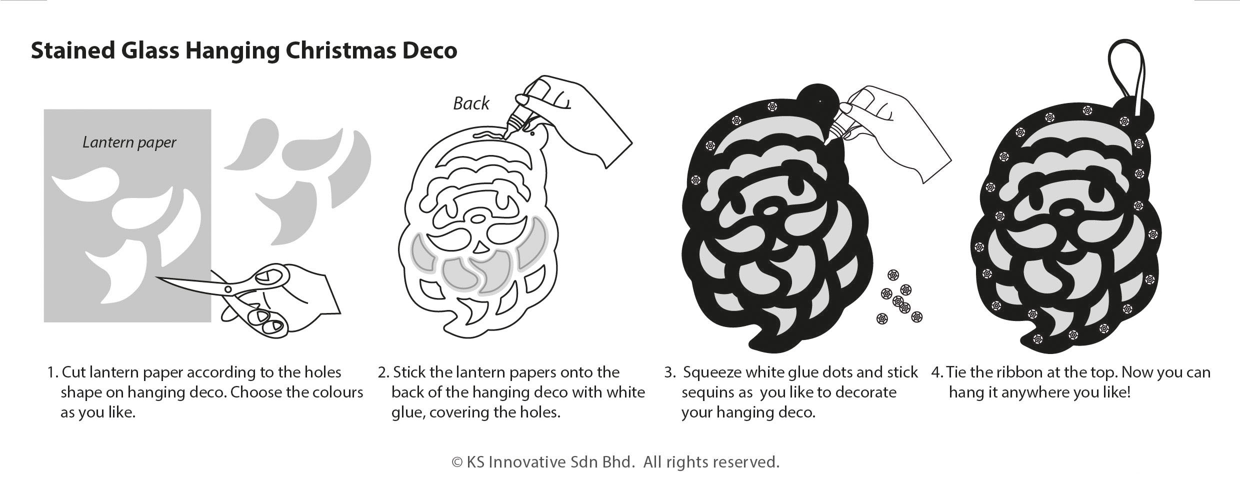 Create these colourful 'stained glass' effect paper hanging deco and liven up your Christmas celebration! Have fun cutting and assembling lantern sheets and paste them where you'd like them to be on the pre-cut design. Stick beautiful sequins for final touches!