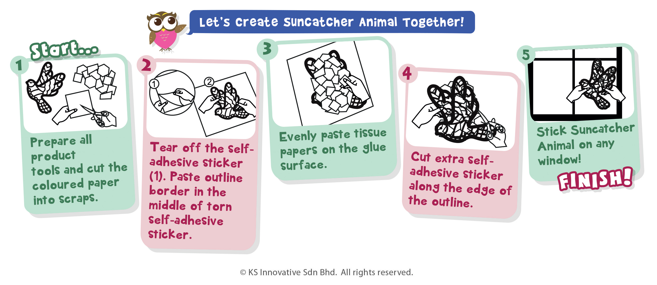 Let the sun ray shine through adorable Animal Suncatcher Papers and bursting with colourful rays from your windows! They come in 9 different animal character designs - Seahorse, Butterfly, Crab, Owl, Fish, Bird, Dolphin, Unicorn and Sea Turtle. These stained glass effect self-adhesive craft displays nicely on windows and letting the sun shine through them makes the reflective light all the more colourful and interesting! Create the colourful effect by pasting coloured paper on top of each other. Scissors is needed to cut each shape out.