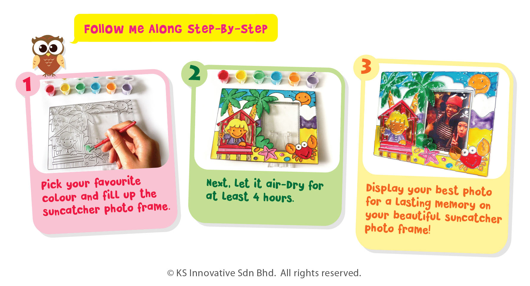 Another of our very popular craft, the suncatcher photo frame painting kit comes with a beautifully designed suncatcher photo frame stand and complete with colouring tools. Kids only have to mix and fill in colours that they like, creating beautiful masterpieces. Let the sun rays shine through the finished transparent craft! Fits a 2.5" x 7" photo. You may decorate atop your mantelpiece, study desk or wall rack!